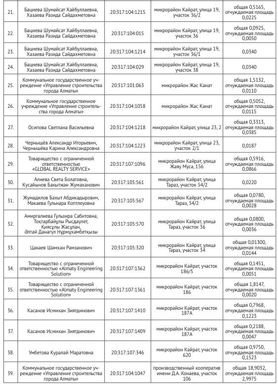 Согласно постановлению акимата от 30 марта 2026 года, опубликованному в газете “Вечерний Алматы”, всего для строительства дороги изымут 39 земельных участков, расположенных в микрорайоне Кайрат Турксибского района.
