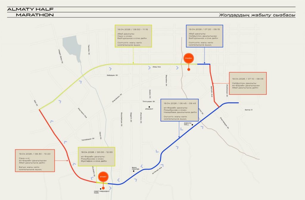 В связи с загруженностью дорог, участникам рекомендовали добираться до места старта (Парк первого президента) на автобусе до пересечения проспекта Аль-Фараби и улицы Мустафина. Вместе с тем сообщается, что парковка возле стартового (Парк первого президента) и финишного городка (Центральный стадион) будет невозможна.
