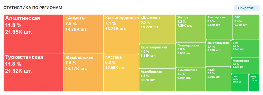 Если смотреть на географию закредитованности, заметен чёткий региональный антирейтинг. В лидерах по количеству обращений – южные регионы и мегаполисы. Первое место делят Алматинская и Туркестанская области – на них приходится по 11,8% всех заявок (почти по 22 тысячи обращений в каждом регионе). Следом идут город Алматы (7,9% или почти 14,8 тысячи заявок), Жамбылская (7,6%) и Кызылординская (7,1%) области. Столица занимает в этом списке лишь шестую строчку (6,8% или почти 12,6 тысячи заявок).