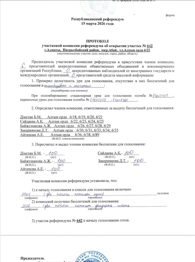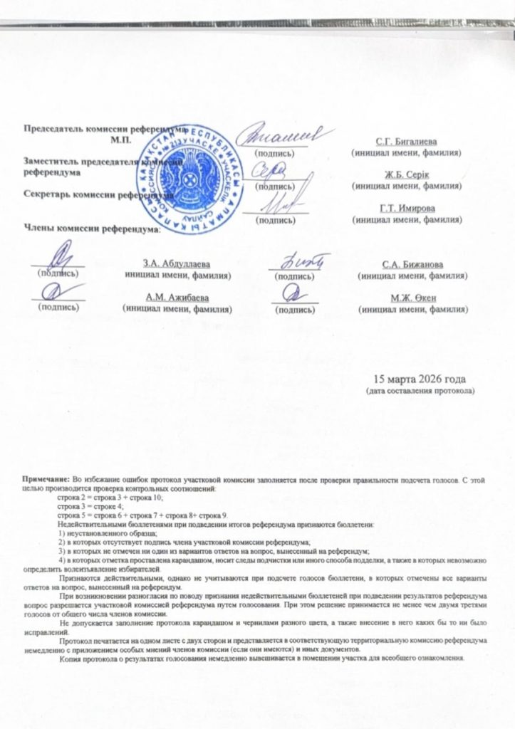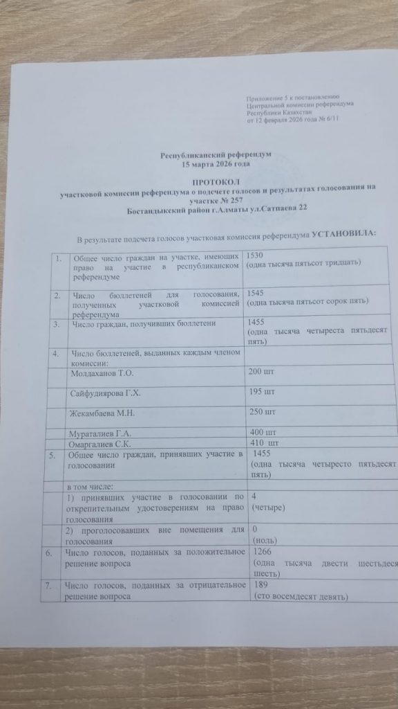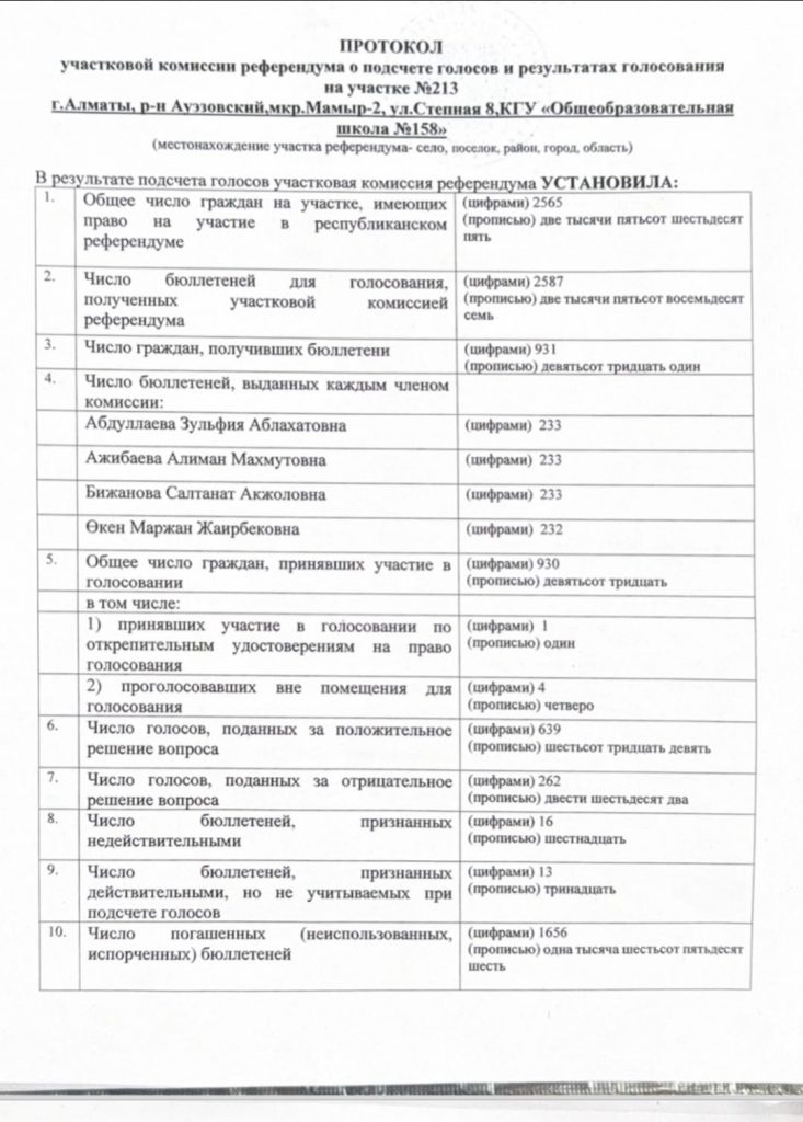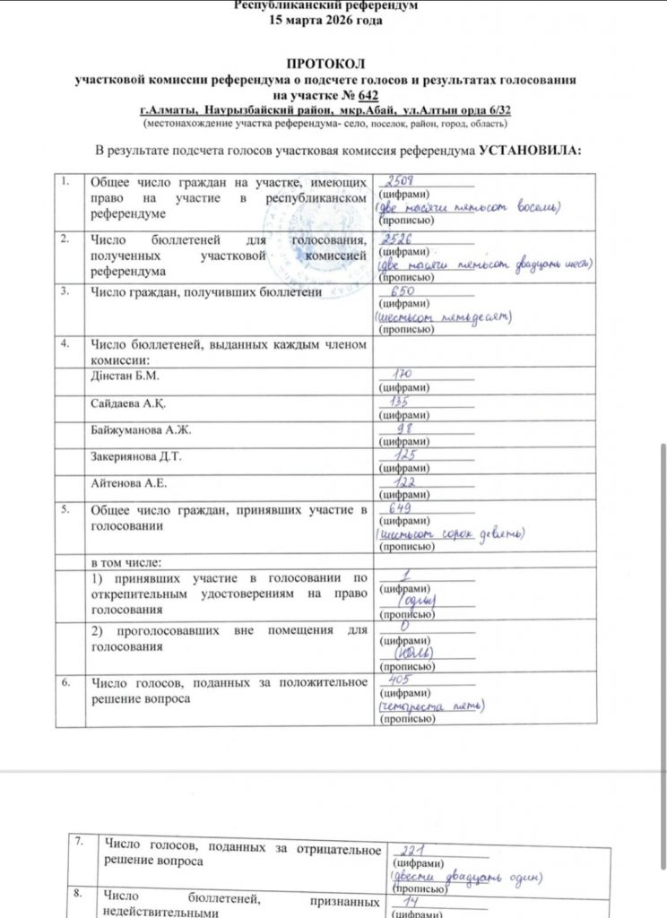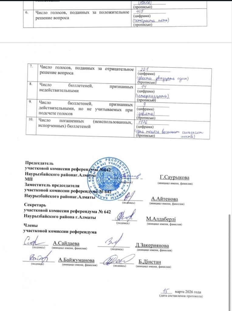 Так, на участке №642 в Наурызбайском районе Алматы 405 избирателей проголосовали «за», тогда как 221 — «против».