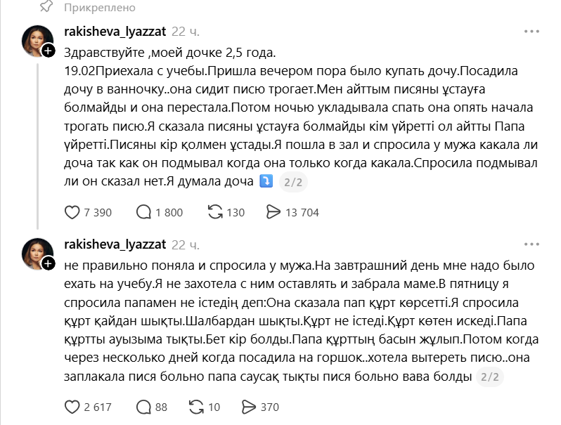 Правозащитница Лязат Ракишева в Threads опубликовала обращение матери, которая заявила о действиях сексуального характера к их 2,5-летней дочери, передаёт Centralmedia24.
