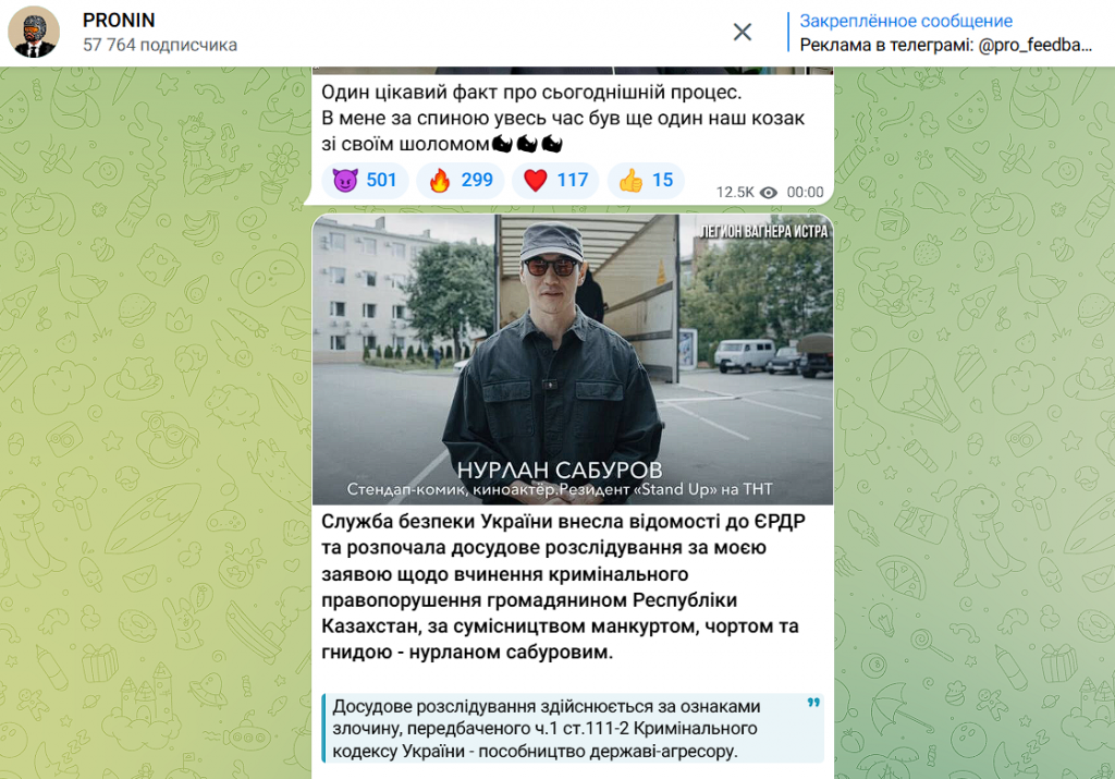 «Служба безопасности Украины внесла сведения в ЕРДР и начала досудебное расследование по моему заявлению о совершении уголовного правонарушения гражданином Республики Казахстан, по совместительству манкуртом, чертом и гнидой — нурланом сабуровым. Досудебное расследование проводится по признакам преступления, предусмотренного ч. 1 ст. 111-2 Уголовного кодекса Украины — пособничество государству-агрессору», — говорится в сообщении Пронина.
