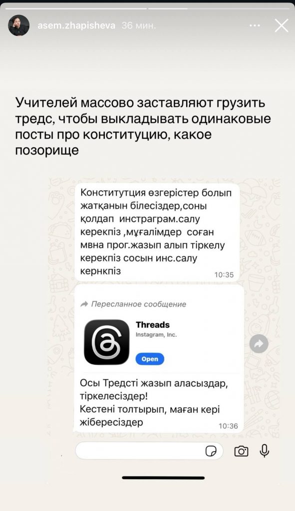 В социальных сетях появились публикации со скриншотами переписок в чате преподавателей, на которых видны сообщения с указанием скачать приложение Threads и написать пост в поддержку проекта новой Конституции.