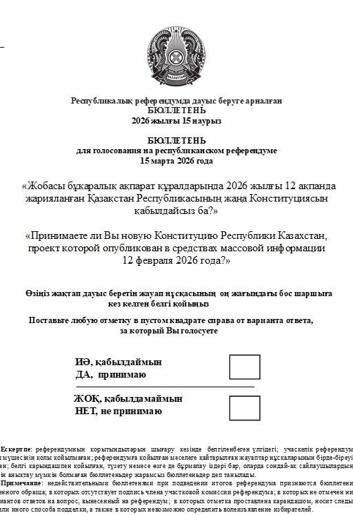15 марта в Казахстане пройдёт референдум. Голосовать «за» или «против» новой Конституции приглашают всех граждан страны. По данным Центризбиркома, бюллетень будет выглядеть следующим образом: