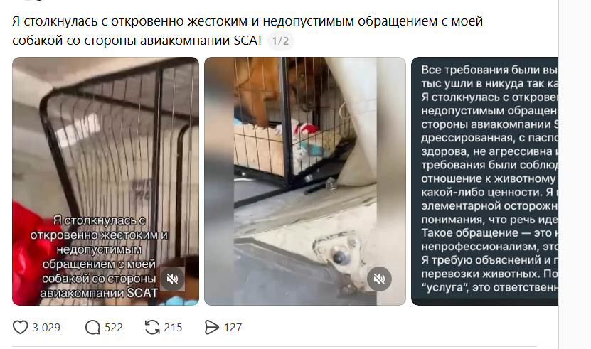 В авиакомпании SCAT прокомментировали инцидент и сообщили, что заявку на перевозку животного оформили в установленном порядке: