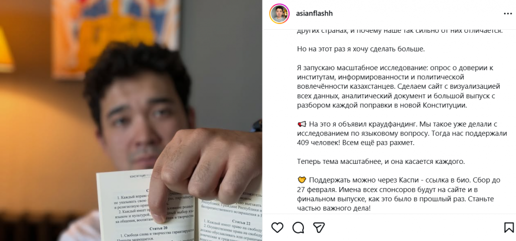 На днях в социальных сетях развернулся интересный кейс. В схватке мнений сошлись блогер Мурат Данияр (известный как Jurttyn balasy) и политолог Арсен Сарсеков. Поводом стал опрос, проведённый блогером по поводу Конституционной реформы.