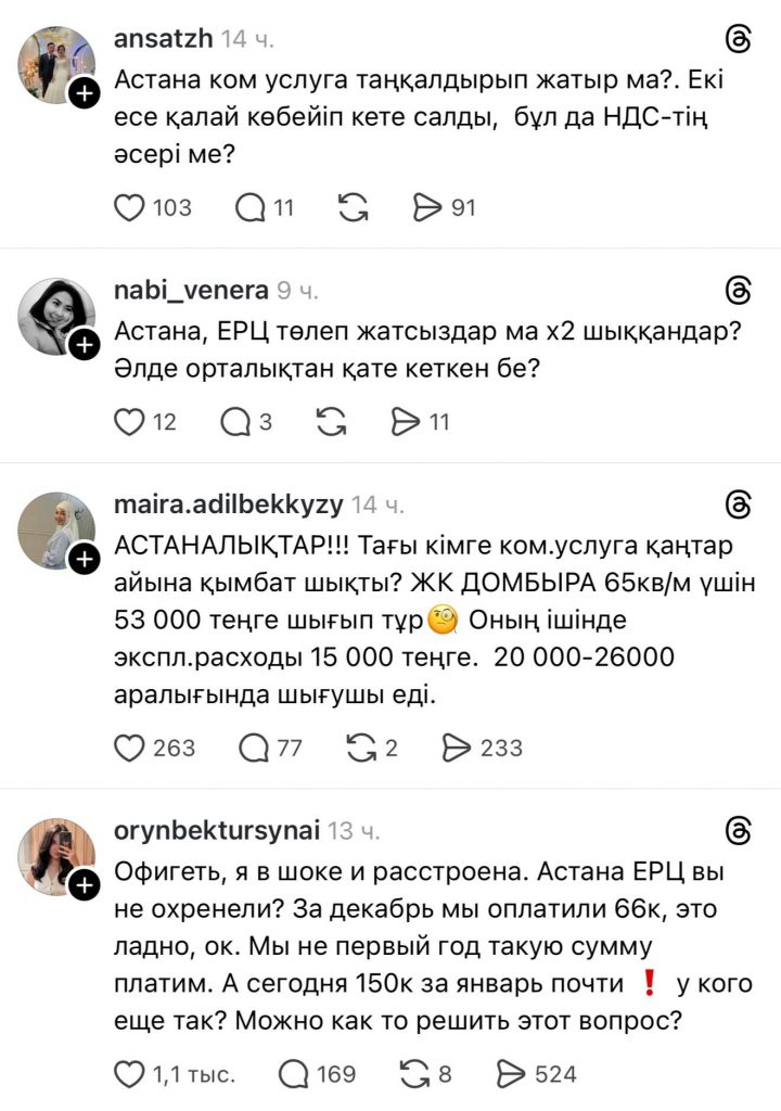Посты о том, что комуслуги подорожали почти в два раза, а то и больше, заполонили социальную сеть Threads. Астанчане получили квитанции и сразу стали выражать своё недовольство. Пользователи начали перебирать возможные причины такого резкого скачка тарифов и предположили, что всё из-за повышения НДС с начала 2026 года.
