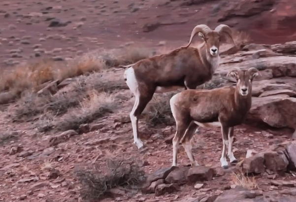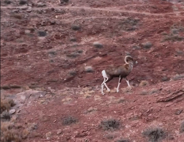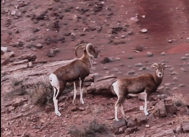 На кадрах животное свободно передвигается в горной местности. На другом видео архара уже два.