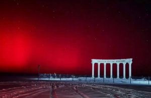 По данным специалистов, это красное полярное сияние, возникающее во время повышенной солнечной активности. Заряженные частицы солнечного ветра взаимодействуют с магнитным полем земли.