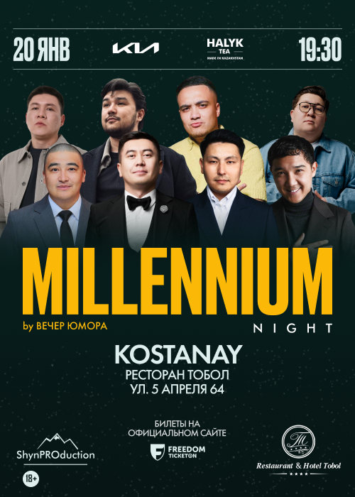 Вечер юмора Millenium night с участием Хакима Мукарама, Ильяса Копжасарова, Тимура Билалова, Айдоса Кожахметова, Адилета Бисариева, Даурена Тогисова, Ильяса Джапарова и Шынгыса Куанышканова в Костанае (Restoran Tobol, ул. 5 апреля 64, 20:30). Билеты от 8 000 тенге.