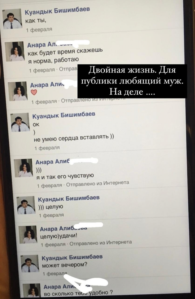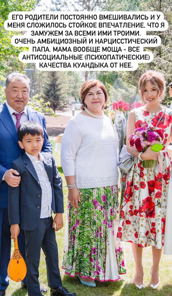 «У меня сложилось стойкое впечатление, что я замужем за всеми ими тремя. Его отец очень амбициозный и нарциссический. Мама — вообще мощь. Все антисоциальные (психопатические) качества Куандыка от неё. Я ни за что и ни за какие деньги не променяла бы мою жизнь сейчас на то время. Никогда».
