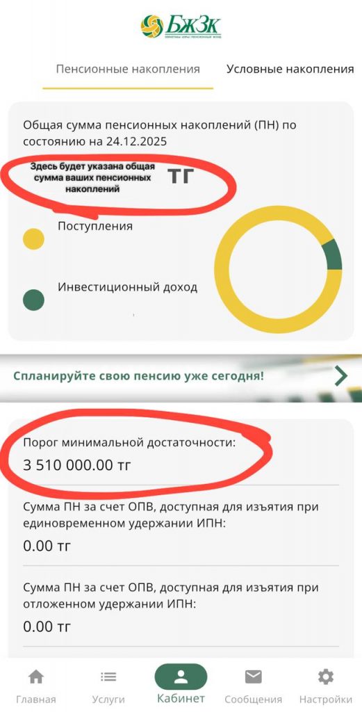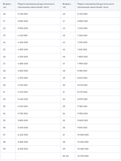 Порог зависит от возраста вкладчика, предполагаемого срока получения пенсии и других параметров. Чем старше человек, тем выше лимит. В 2026 году этот показатель увеличили от 460 до 810 тысяч тенге в зависимости от возраста вкладчика.