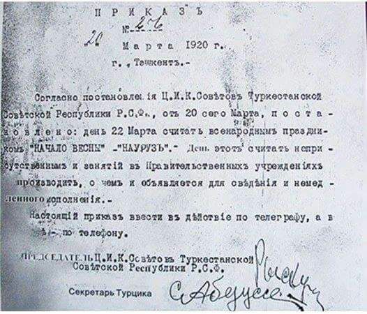 «Согласно постановлению Ц.И.К. Советов Туркестанской Советской Республики Р.С.Ф. от 20 сего марта постановлено: день 22 марта считать всенародным праздником “Начало весны” – “Наурыз”. День этот считать неприсутственным и занятий в правительственных учреждениях не проводить. О чём объявляется для сведения и немедленного исполнения», – сказано в постановлении.