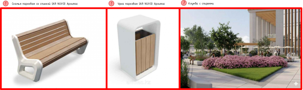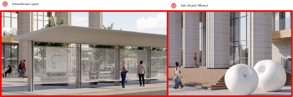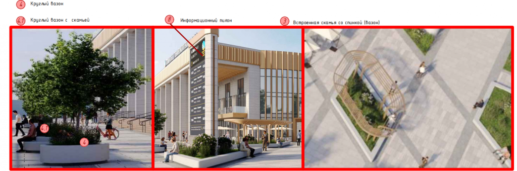 - Элементы озеленения: кустарники в вазонах и стационарных малых архитектурных формах со стороны выхода в город.