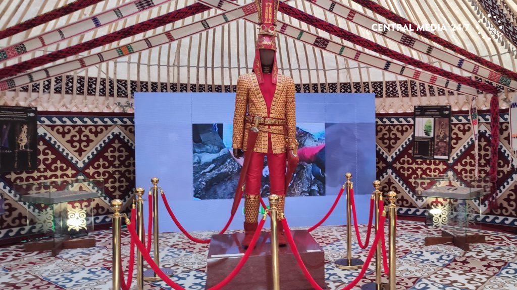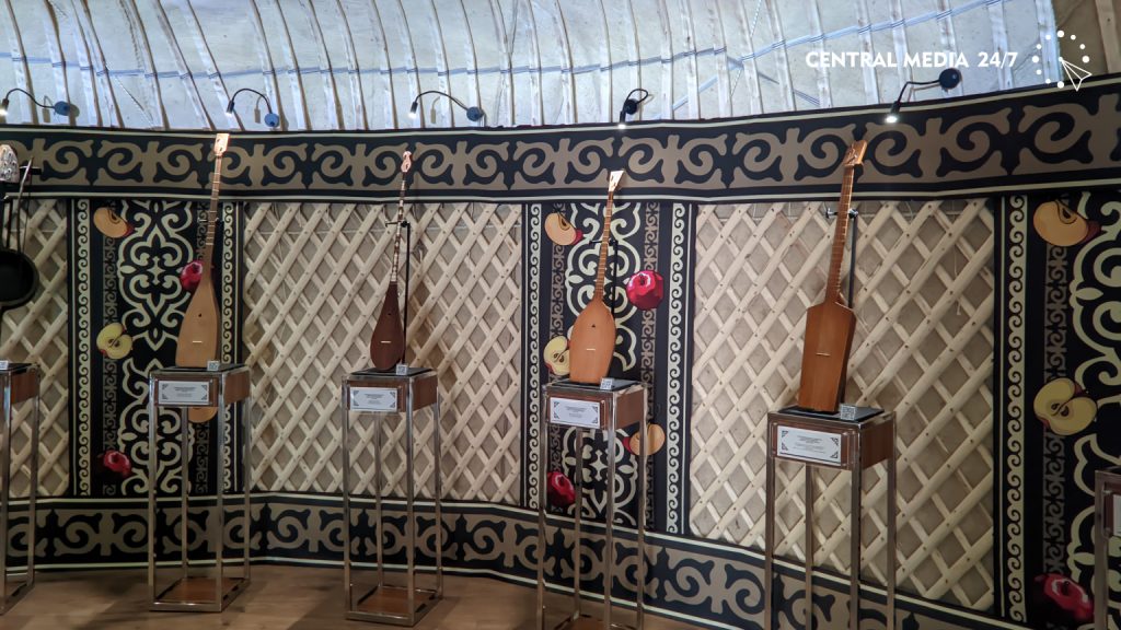 «В этой юрте представлены различные казахские народные музыкальные инструменты из фонда музея имени Ыхласа, в том числе мемориальные – принадлежавшие таким личностям, как Нургиса Тлендиев, Шакарим Кудайбердиев и Дина Нурпеисова. Здесь экспонируются копии, в то время как оригиналы хранятся в музее. Помимо этого, представлены ударные и шумовые инструменты, которые на протяжении долгого времени использовались в казахской культуре: в быту и в военное время. Мы ежегодно представляем наши экспонаты на подобных мероприятиях».