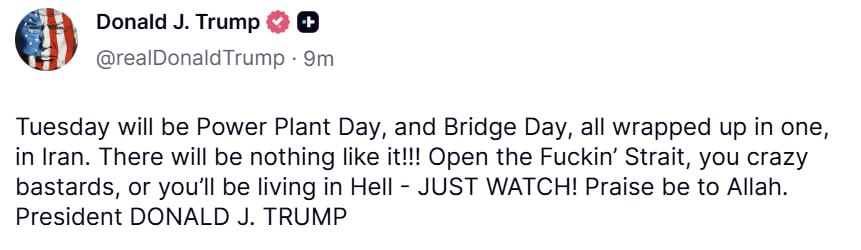 «Откройте этот е****й пролив, сумасшедшие ублюдки, или вы будете жить в аду». Трамп в соцсети Truth пообещал, что во вторник в Иране будет «день электростанций и мостов», — написал Трамп в своей сети Truth Social.