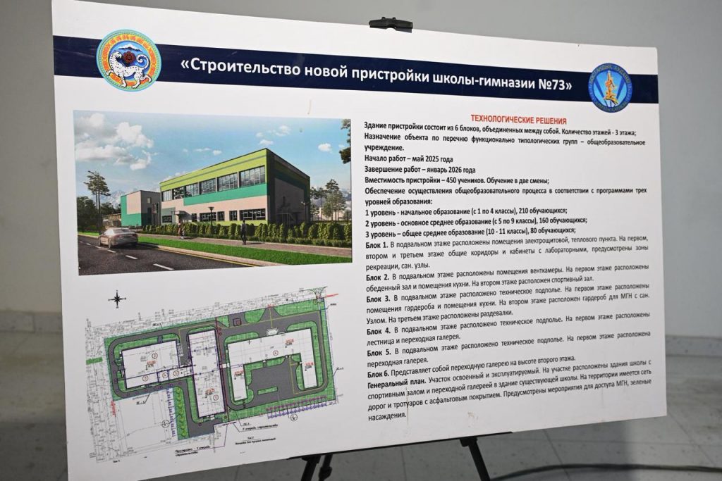 Также глава мегаполиса ознакомился с ходом работ по возведению пристройки к школе-гимназии №73 в Бостандыкском районе. Строят её за счёт частных средств в рамках социальной ответственности бизнеса.