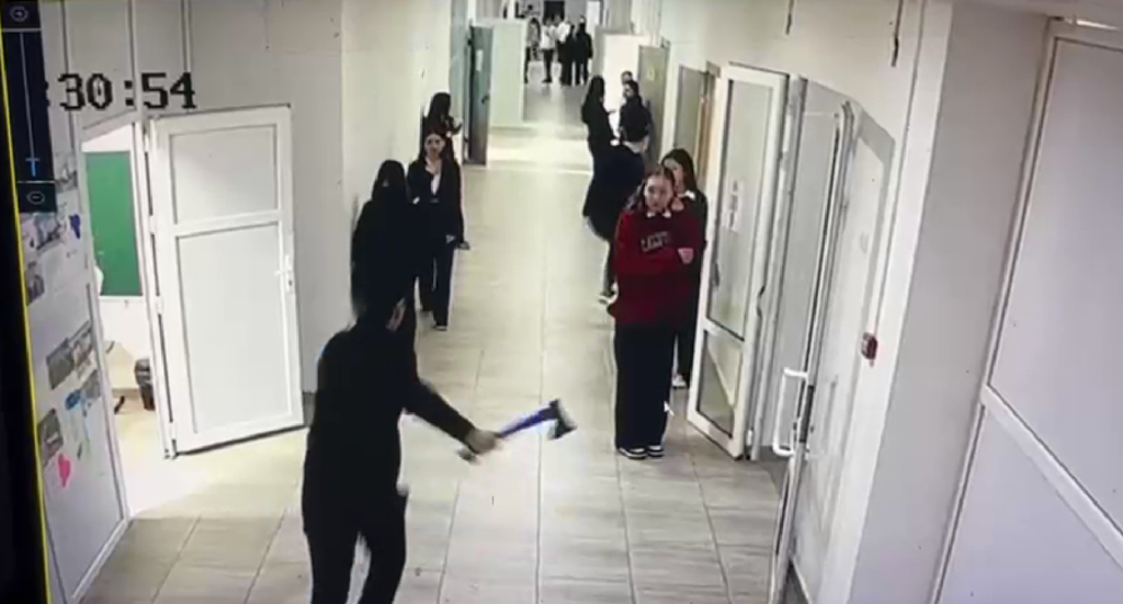 На записи видно, как ученик с топором бегает по школьному коридору и, предположительно, преследует другого школьника. Тот укрылся в одном из классов. Остальные дети, не понимая, что происходит, просто наблюдают за происходящим и идут по своим делам.