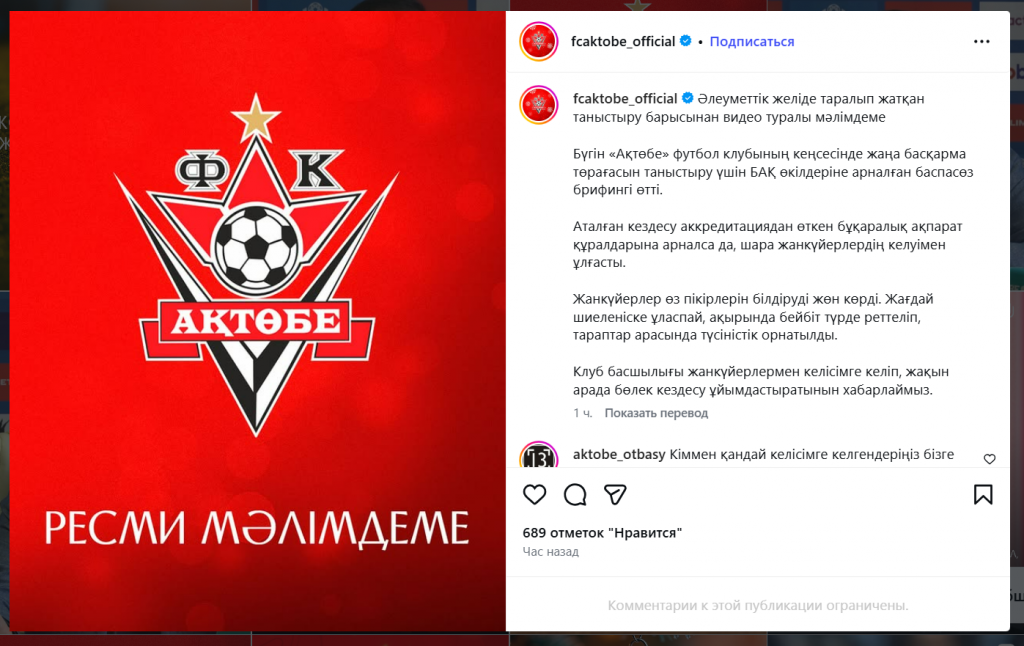 Также в клубе заявили, что фанатское сообщество восприняло новость о переходе в частные руки позитивно. Однако, видимо, фигура нового предправления Армана Оспанова пришлась по душе не всем. Несколько болельщиков пришли на пресс-конференцию и принесли плакаты с нелицеприятными высказываниями в соцсетях Оспанова в адрес ФК “Актобе” и потребовали его отставки.