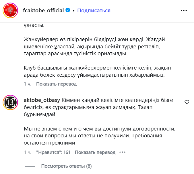 В клубе уже поспешили уверить, что конфликт решен и стороны пришли к согласию. Однако тут же в комментариях болельщики заявили, что продолжают настаивать на своих требованиях.