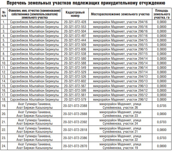 Кроме того, в постановлении акимата №1/1-88 сказано, что в микрорайоне Мадениет Алатауского района изымут 24 участка для строительства парковки к школе №196. Датой завершения процедуры принудительного отчуждения определили 31 декабря 2028 года. Список участков: