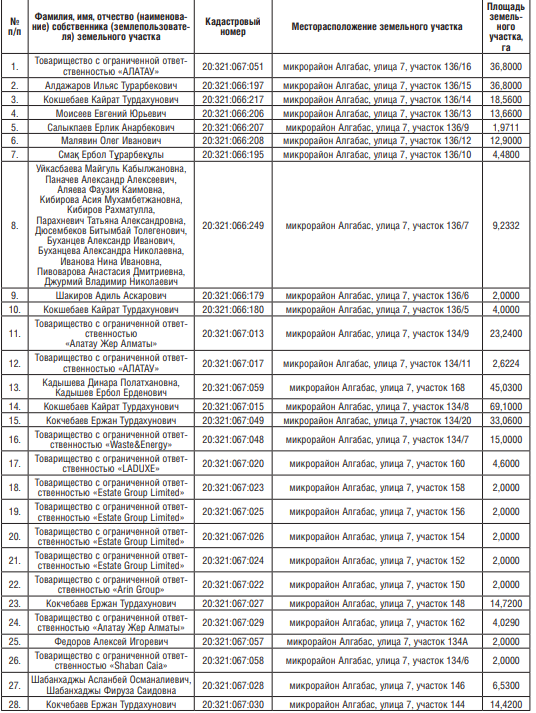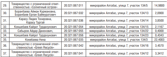 37 земельных участков, расположенных в микрорайоне Алгабас Алатауского
