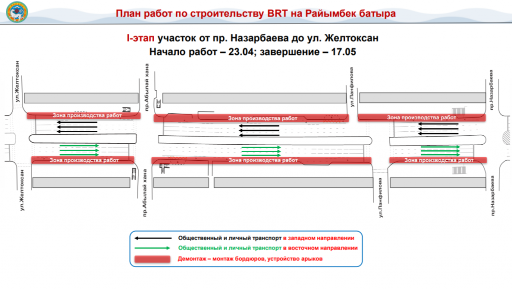 «Работы пройдут в два этапа. До июня — монтаж арыков, остановок и переноса коммуникаций с частичным ограничением движения. С июня — укладка асфальта, разметка, обновление тротуаров, велодорожек и озеленение», — добавили в ведомстве.