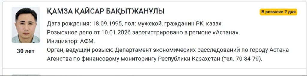 Розыскное дело в отношении Кайсара Камзы (1995 года рождения) зарегистрировали 10 января 2026 года в Астане. Таким образом, блогер находится в розыске уже второй день.