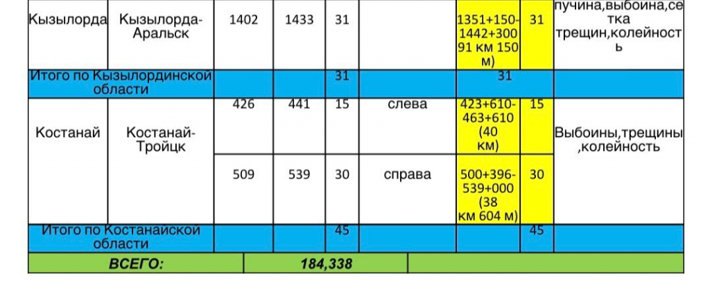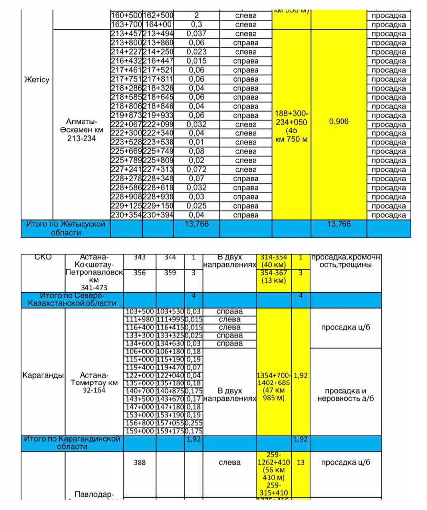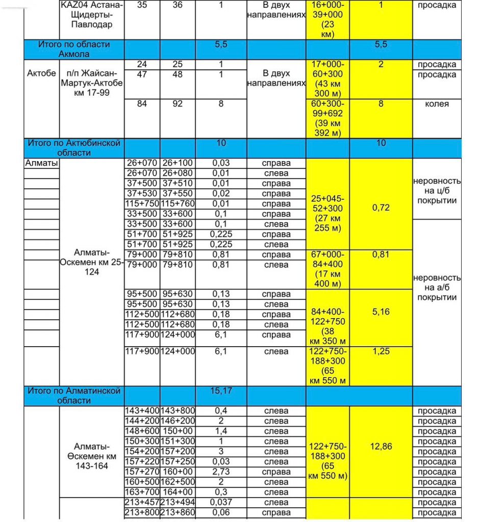Такие участки по итогам обследования состояния дорог выявили на трассах в следующих областях: Абайской, Акмолинской, Актюбинской, Алматинской, Жетысуской, Западно-Казахстанской, Карагандинской, Костанайской, Кызылординской, Павлодарской, Северо-Казахстанской и Туркестанской.